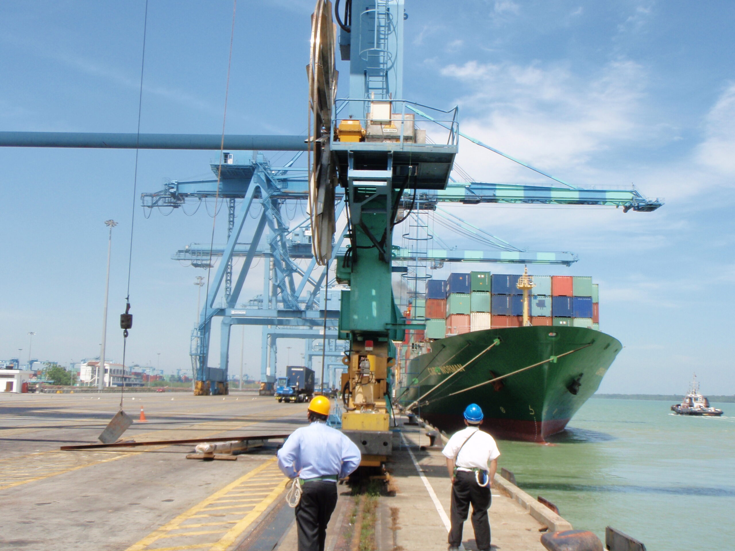 lifting and moving heavy loads within a confined area, typically found in shipyards and industrial settings.